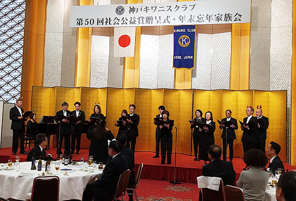 - 来賓の方々や近隣のキワニスクラブから多数ご参加頂きました。式典冒頭では神戸キワニスビルダーズ・キークラブメンバーからのクリスマスレイの贈呈や、年末忘年家族会ではメンバーによる合唱、豪華賞品のハッピースマイルオークションなど盛りだくさんのプログラムでした。